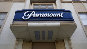 The Paramount logo is displayed above an entrance to Paramount Studios on Feb. 23, 2026 in Los Angeles, California. Justin...