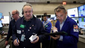 Traders work on the floor at the New York Stock Exchange (NYSE) in New York City, U.S., February 25, 2026....