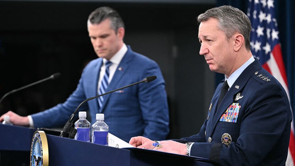(L/R) US Secretary of Defense Pete Hegseth looks on as Chairman of the Joint Chiefs of Staff General Dan Caine...