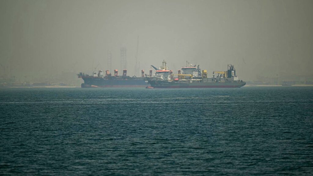 Cargo ships in the Gulf, near the Strait of Hormuz, as seen from northern Ras al-Khaimah, near the border with...