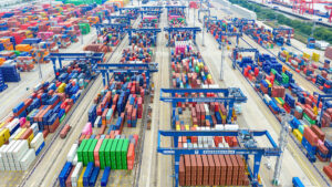 Container backlog occurs at Longtan Port Container Terminal in Nanjing, Jiangsu Province, China, on September 21, 2025. (Photo by Costfoto/NurPhoto...