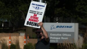 A worker pickets outside the Boeing Defense, Space & Security facility in Berkeley, Missouri, US, on Monday, Aug. 4, 2025....