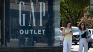 A sign hangs in a GAP Outlet store window on May 29, 2025 in Chicago, Illinois. Scott Olson | Getty...