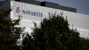 This photograph taken on October 30, 2022, shows the logo of the Swiss pharmaceutical and drug maker Novartis on a...