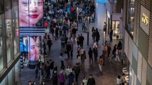 People walk in a shopping mall in the Sanlitun area in Beijing, China, on April 4, 2025.Kevin Frayer | Getty...