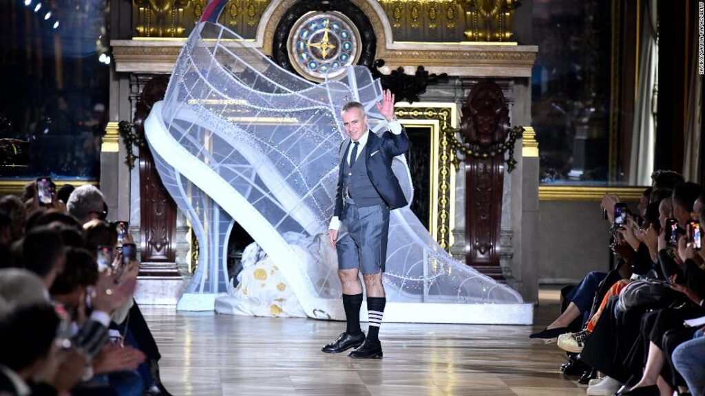 A model wears a design from the Thom Browne Spring-Summer 2023 collection, debuted in Paris in October last year. Credit: Peter White/Getty