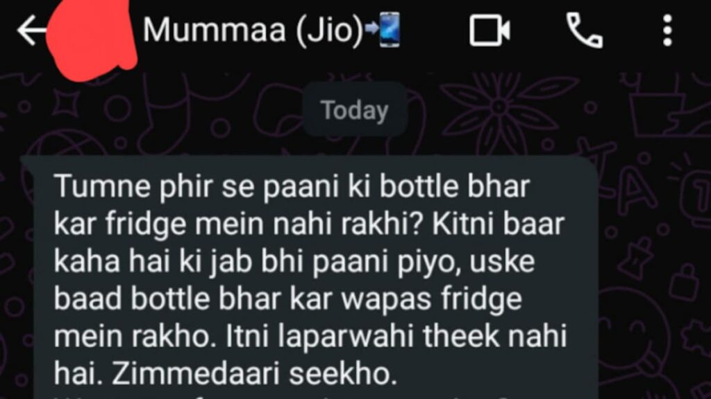 The text (from the mom) in Hindi reads, “Tumne phir se paani ki bottle bhar kar fridge mein nahi rakhi? Kitni baar kaha hai ki jab bhi paani piyo, uske baad bottle bhar kar wapas fridge mein rakho. Itni laparwahi theek nahi hai. Zimmedaari seekho. Want a softer or stricter version?” (“You didn’t refill the water bottle again and put it back in the fridge? How many times have I told you: whenever you drink water from it, refill the bottle and put it back in the fridge. This kind of carelessness isn’t okay. Learn how to be responsible. Want a softer or stricter version?”)