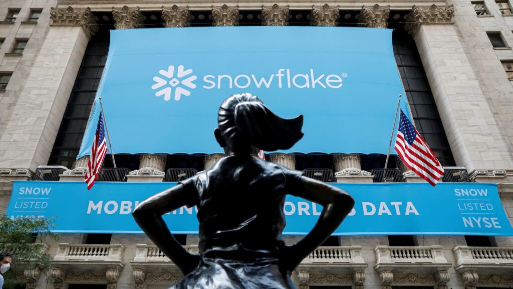 A banner for Snowflake Inc. is displayed at the New York Stock Exchange to celebrate the company’s initial public offering on Sept. 16, 2020.