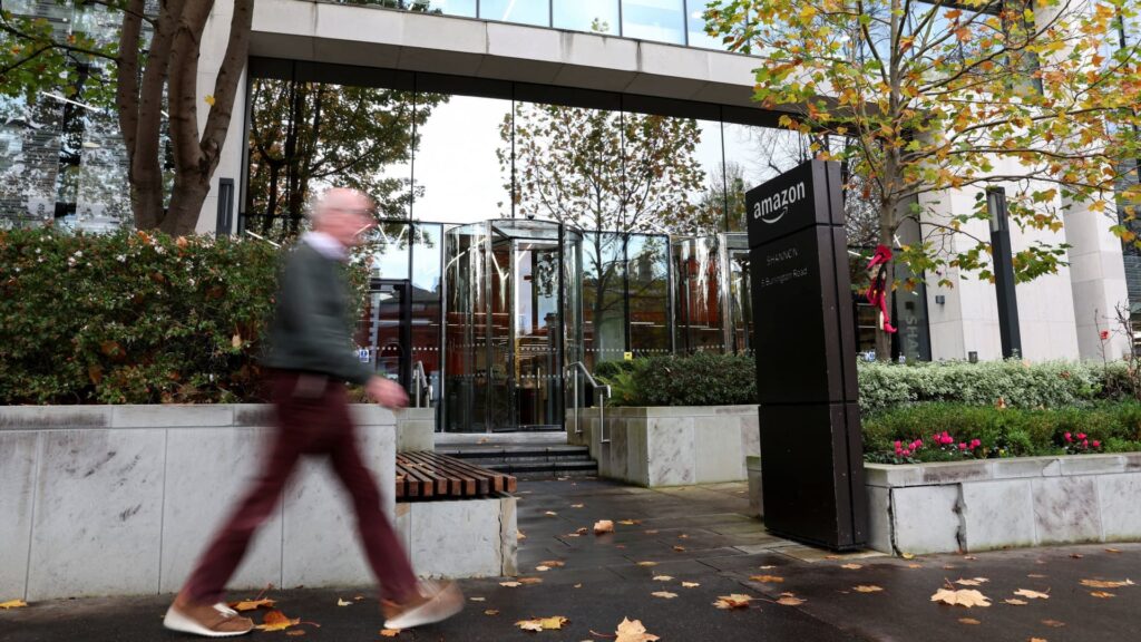 A pedestrian walks past Amazon Ireland corporate offices in Dublin, as Amazon.com, Inc., said on Tuesday it plans to cut its global corporate workforce by as many as 14,000 roles and seize the opportunity provided by artificial intelligence (AI), in Dublin, Ireland, Oct. 28, 2025.