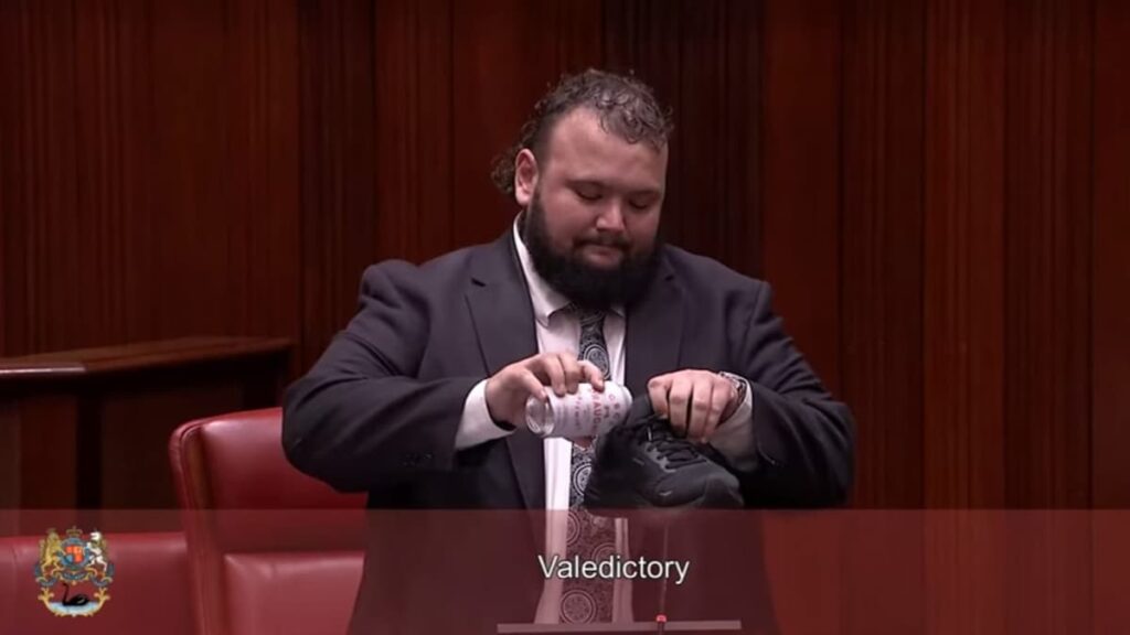 In his valedictory speech in the Parliament of Western Australia on May 21, 2025, Kyle McGinn said, “There was only one way to do it. And I am used to getting told off. So we might as well get this over and done with. But I would like to say to the members and the constituents across WA, thank you for two fantastic terms. Cheers.” He then cracked open a beer can, took his shoe that he had already placed on the table before beginning his speech, poured the drink into the footwear and chugged it. Soon after, several other parliamentary members broke into applause.