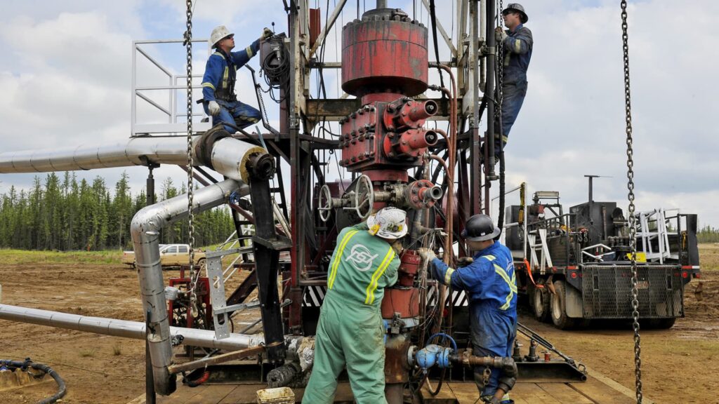 Roughnecks build a drilling rig in an oil field at the MEG Energy site near Fort McMurray, Alberta, Canada.