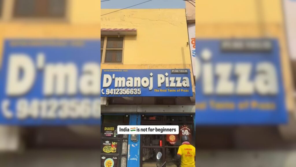 A content creator recently posted a video on Instagram that left viewers amused. The video begins with the creator saying, “Pehle America kehta tha, kya hai tu, ab hum kehte hai, tu kya hai, ye dekho, D’manoj Pizza” (“Earlier, America would say, ‘Who are you?’ Now, we say, ‘Who are you? Look at this, D’manoj Pizza.”). The clip showed a small roadside pizza outlet. Nothing fancy, just a modest setup with a “pure veg” promise plastered on the shop. The tagline on the sign outside the store reads, “The Real Taste of Pizza”.