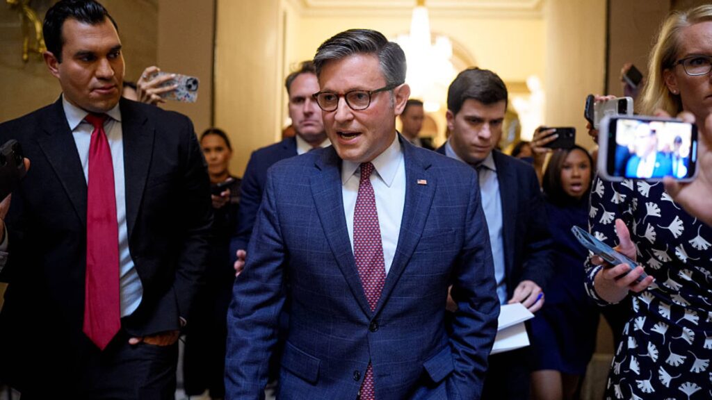 U.S. Speaker of the House Mike Johnson (R-LA) speaks to reporters at the U.S. Capitol on July 21, 2025 in Washington, DC. Congressional Lawmakers have returned to work on Capitol Hill after the weekend.