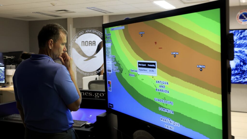 Jamie Rhome, Deputy Director of the National Hurricane Center, looks at a screen showing paths that Tropical Storm Erin could take as they continue to track its progress at the National Hurricane Center on August 13, 2025 in Miami, Florida.