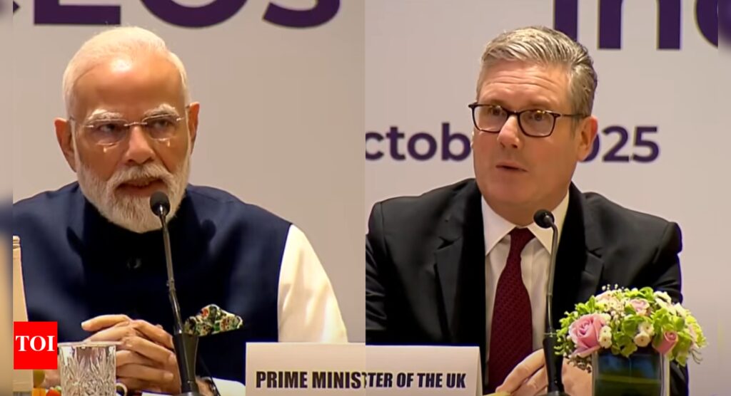 NEW DELHI: Prime Minister Narendra Modi and UK PM Keir Starmer, who is on visit to India, addresses the India-UK CEO Forum in Mumbai on Thursday, talking about market access, bilateral trade and economic cooperation between the two nations with target of doubling trade by 2030 from current $56 billion. “This year has been unprecedented, enhancing the stability of India-UK relations amid the current global volatility. During my visit to the UK in July this year, we signed the Comprehensive Economic and Trade Agreement (CETA). I deeply appreciate and congratulate my friend Prime Minister Starmer for his commitment and vision for this historic achievement. This is not just a trade agreement, but a roadmap for shared progress, shared prosperity, and shared people between the world’s two largest economies,” said PM Modi.Further referring to the likely impact of the agreement, he added, “Along with market access, this agreement will strengthen MSMEs in both countries. It will also open new doors of employment for millions of youth.”Then he went on to explain CETA saying, “To ensure that this Comprehensive Economic and Trade Agreement (CETA) reaches its full potential, I would like to present four new dimensions to this CETA. These new dimensions of my CETA will perhaps broaden it considerably. ‘C’ stands for Commerce and Economy. ‘E’ stands for Education and People-to-People Relations. ‘T’ stands for Technology and Innovation. ‘A’ stands for Aspiration.“Further talking about the hopes to increase trade PM also said, “Today, our bilateral trade is approximately $56 billion. We have set a target of doubling it by 2030. I am confident that we can achieve this target ahead of time.”