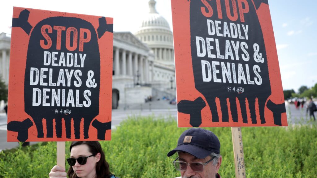 Advocates hold signs during a news conference on Medicare Advantage plans in front of the U.S. Capitol on July 25, 2023 in Washington, DC.