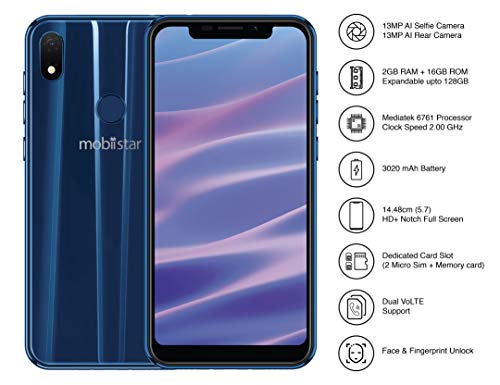 GENERAL2G NetworkGSM 900/1800 3G Network” WCDMA B1/B8″ 4G NetworkLTE FDD B3/B5, LTE TDD B40/B41 Dual VolteYes SIMDual SIM (nano SIM) SIM Slot HybridNo [ Dedicated Slot Available for SIM Cards and Memory Card] SIZEDimension145.78*70.8*8.7mm Weight161g DISPLAYType5.7 inches IPS LCD, support 16mil colors Resolution720*1498 HD+, 2.5D glass Notch Display MultiTouch5 point SOUNDNotification typeVibrate, MP3 ringtone SpeakerYes Support jack 3.5mm Yes STORAGEPhonebookNo limit (depend on free phone storage) Call historyNo limit (depend on free phone storage) Micro SD cardT-Flash (microSD), support up to 128GB “Internal storage : ROM 16GB – RAM 2GB DATAGPRSClass 12 EDGEClass 12 3G SpeedHSDPA cat24(42Mbit/s) (Up-to), HSUPA cat7(11.5Mbit/s) (Up-to) 4G LTE speedLTE Cat 6, Down 300Mbps(Up-to), 75Mbps (Up-to) WLANWi-Fi 2.4 GHz: 802.11 b/g/n, Wi-Fi 5 GHz: 802.11 a/n, Wifi hotspot BluetoothBT4.2 NFCNo USBmicroUSB v2.0, OTG CAMERARear camera13.0MP with AI Scene Detection, PDAF Auto Focus, Led flash Front camera13.0MP with AI Video recorderYes, support HD 1080p,30fps FEATURESOSAndroid 8.1 Oreo ChipsetMTK MT6761 CPUQuad Core cortex-A53 2.0Ghz; IMG GE8300 SensorG-sensor, Light sensor, Proximity sensor MessageSMS, MMS BrowserHTML FM radioFM Stereo GPSYes LanguageMultilanguage Color: Saphire Blue OthersFacial unlock BATTERYTypeLi-Po 3020 mAh Standby timeUp to 420 hours (depend on network conditions and user behavior) Talking timeUp to 10hours (2G)/ 6 hours (3G)/ 5 hours (4G)(depend on network conditions and user behavior)