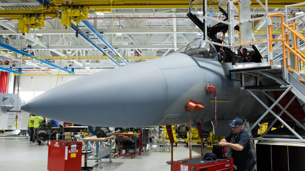 A worker performs quality checks on a Boeing Co. F/A-18 Super Hornet fighter aircraft at the Boeing Defense, Space & Security facility in St. Louis, Missouri, U.S., on Monday, July 24, 2018.