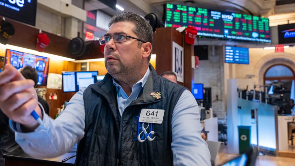 Traders work on the floor of the New York Stock Exchange on July 23, 2025 in New York City.