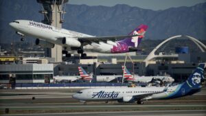 An Alaska Airlines plane and a Hawaiian Airlines plane at Los Angeles International Airport in Los Angeles on Dec. 5,...