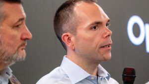 Oracle CEO Clay Magouyrk, center, speaks on a media tour of the Stargate data center in Abilene, Texas, on Sept....