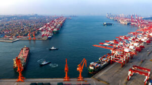 A cargo ship loads and unloads containers at the Qianwan Container Terminal of Qingdao Port in Qingdao City, Shandong Province,...
