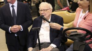 Warren Buffett and Greg Abel walkthrough the Berkshire Hathaway Annual Shareholders Meeting in Omaha, Nebraska on May 3, 2025. David...