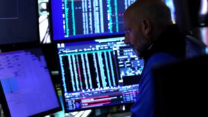 A trader works on the floor of the New York Stock Exchange (NYSE) at the opening bell on October 1,...