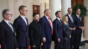 U.S. President Donald Trump and Ukrainian President Volodymyr Zelenskyy pose for a picture with European leaders following a meeting in...