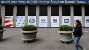 A news ticker outside Fox News headquarters reads: Grand jury votes to indict former President Donald Trump, at the News...