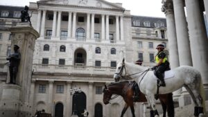 Mounted police officers sit in outside the Royal Exchange and the Bank of England in London on June 17, 2020.TOLGA...