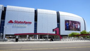 A large banner is installed prior to the Charlie Kirk memorial services at State Farm Stadium on Saturday, Sept. 20,...