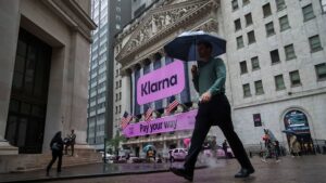 Klarna Group Plc signage during the company's initial public offering (IPO) at the New York Stock Exchange (NYSE) in New...