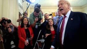 U.S. President Donald Trump leaves after signing the “GENIUS Act” into law during a ceremony in the East Room of...