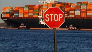 A cargo ship sits outside of the Port of Elizabeth marine terminal seen from Bayonne, New Jersey, U.S., April 9...