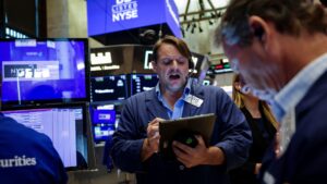 Traders work on the floor of the New York Stock Exchange during morning trading on August 05, 2025 in New...