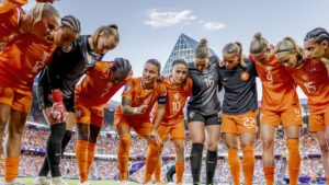 Holland Women huddle during the Euro 2025 match against France at the St Jakob Park on July 13, 2025 in...