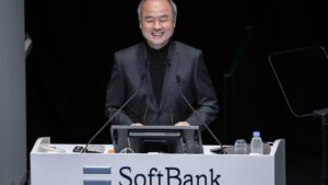 The logo of Japanese company SoftBank Group is seen outside the company's headquarters in Tokyo on January 22, 2025. Kazuhiro Nogi...