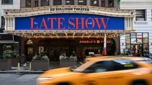 A marquee featuring "The Late Show with Stephen Colbert" is seen outside the Ed Sullivan Theater, where Colbert's show is...