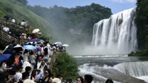 Tourists visit the Huangguoshu Waterfall of "Monkey King" fame in China's Guizhou province on Oct. 5, 2025, during a week-long...