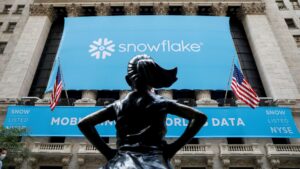 A banner for Snowflake Inc. is displayed at the New York Stock Exchange to celebrate the company's initial public offering...