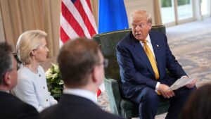 TURNBERRY, SCOTLAND - JULY 27: U.S. President Donald Trump and President of the European Commission Ursula von der Leyen announce...
