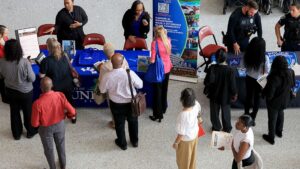Business representatives staff a table at a career fair in Harlem hosted by Assemblymember Jordan Wright on Dec. 10, 2025,...