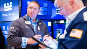 Trader Peter Tuchman wears "2026" glasses as traders work on the floor of the New York Stock Exchange at the...
