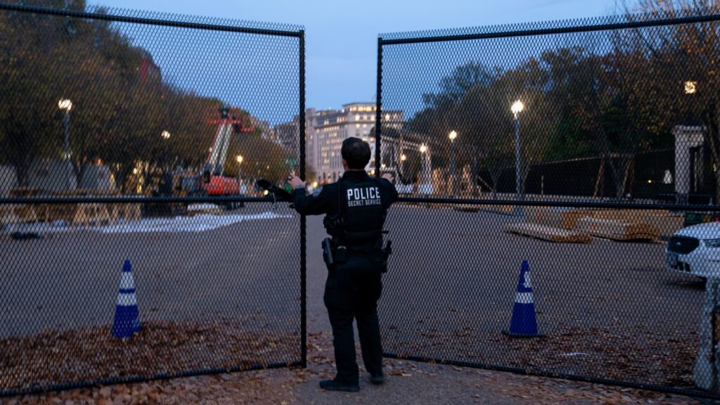 A member of the U.S. Secret Service closes a security gate along Pennsylvania Avenue near the White House on the day before the U.S. presidential election in Washington, U.S., November 4, 2024.