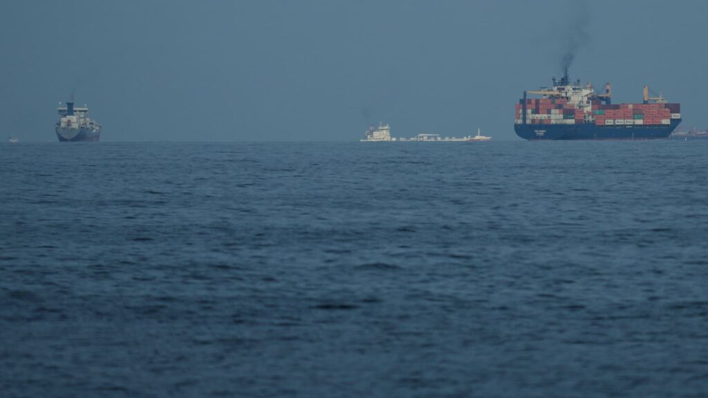 Ships line up in the Strait of Hormuz as seen from Khor Fakkan, United Arab Emirates, Wednesday, March 11, 2026.