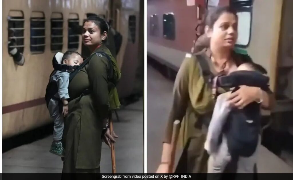The video shows Reena, in uniform and carrying a baton, diligently monitoring passengers at the station while wearing a baby carrier with her one-year-old child asleep inside.