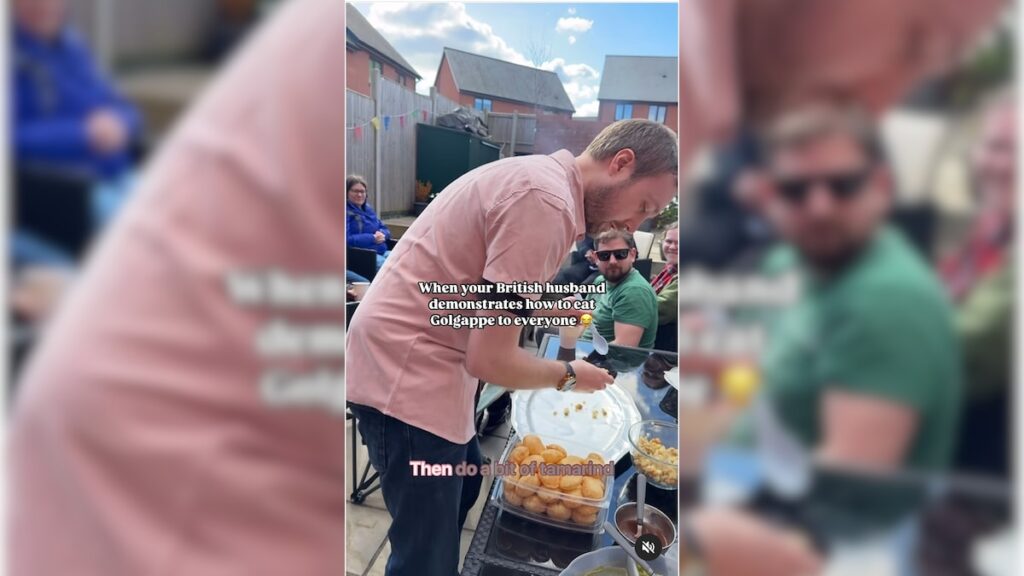 The clip opens to a British-origin man demonstrating how to make the perfect gol gappa to his friends. Displayed on a table before him is a jar of pooris, alongside all the ingredients required to prepare the snack. He begins the gol gappa-making process by filling the poori with mashed potatoes, followed by adding a spoonful of tamarind sauce and some yogurt. Next, he drizzles a small quantity of green chutney into the hollowed-out centre. He advises using the condiment according to an individual’s spice tolerance.