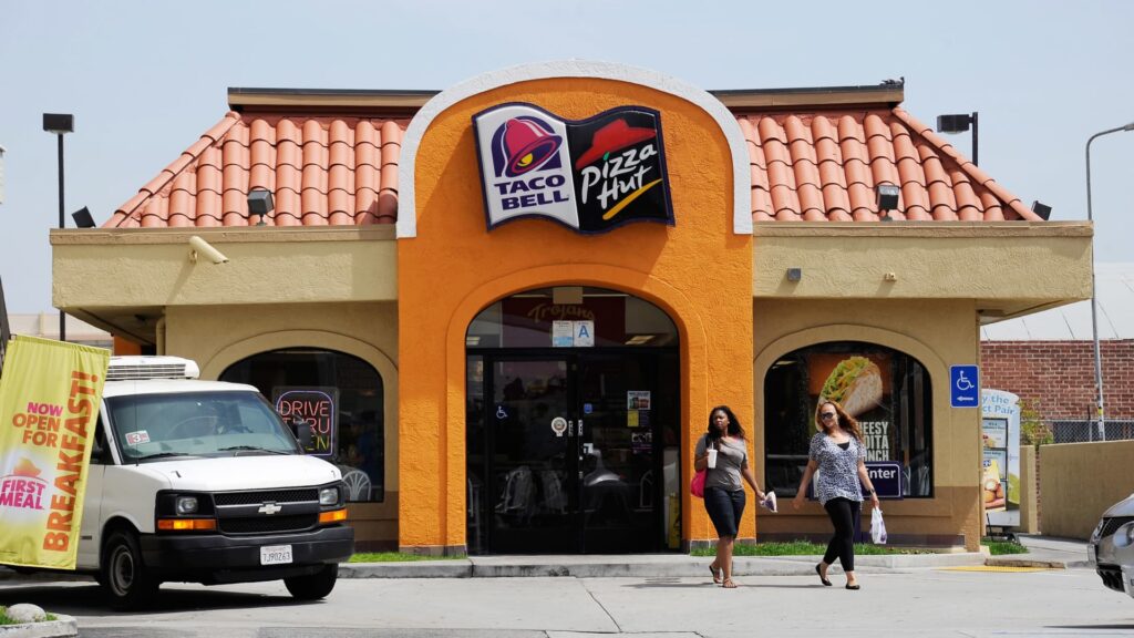 Customers walk out of a Taco Bell and Pizza Hut restaurant during lunchtime in Los Angeles, California.